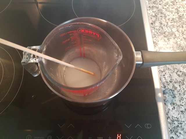 Now add the teaspoon of vegetable glycerin and vegetable oil without stirring. It is important that the mixture is kept warm so that glycerin and vegetable oil are fully integrated.
