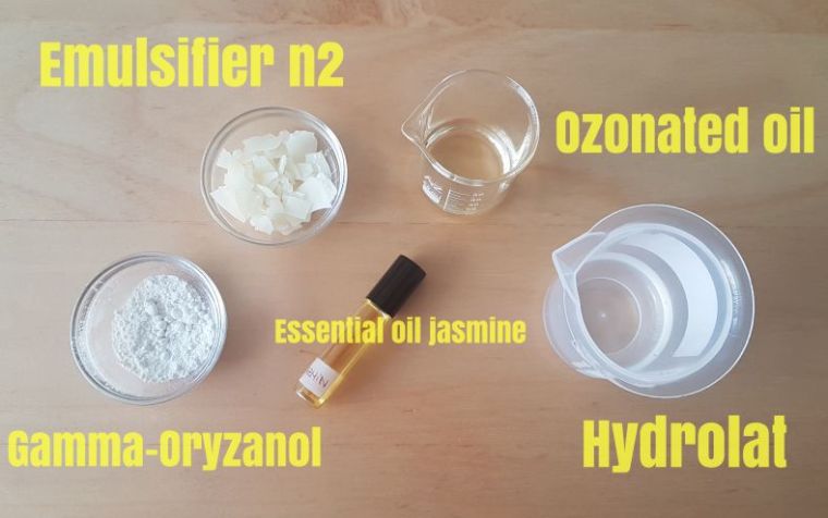 In a separate container, heat the aqueous phase with the hydrolat or distilled water. When the temperature of the hydrolat reaches about 70 degrees, add it to the oil phase and begin to whisk with a cosmetic mixer until the whole is well integrated. And we do not need to add anything else, apart from a few drops of essential oil if we prefer to scent our cream, as the ozone contained in the oil gives it a strong aroma that some people may find somewhat unpleasant. However, if the oil is only partially ozonated, the aroma is usually very mild and pleasant.