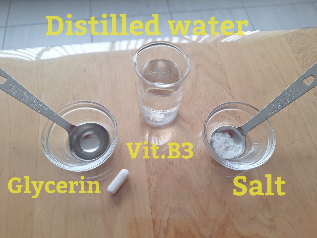 Salt and glycerin are natural preservatives. Your facial serum will remain in good condition without synthetic preservatives. You can add vitamins or water-soluble active ingredients to this serum base. In this case, we have added a capsule of vitamin B3 (niacinamide) for internal use. The results are noticeable.