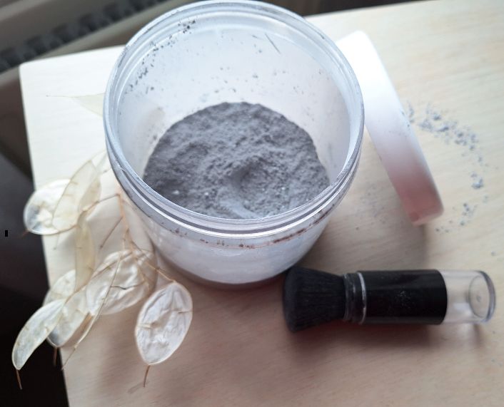 As we said before, we only use three ingredients: a base of commercial talcum powder, a percentage of silica powder (fluffy silica, about half the amount of talcum powder used) to act as an anti-caking agent, and activated charcoal or coffee powder to add colour.