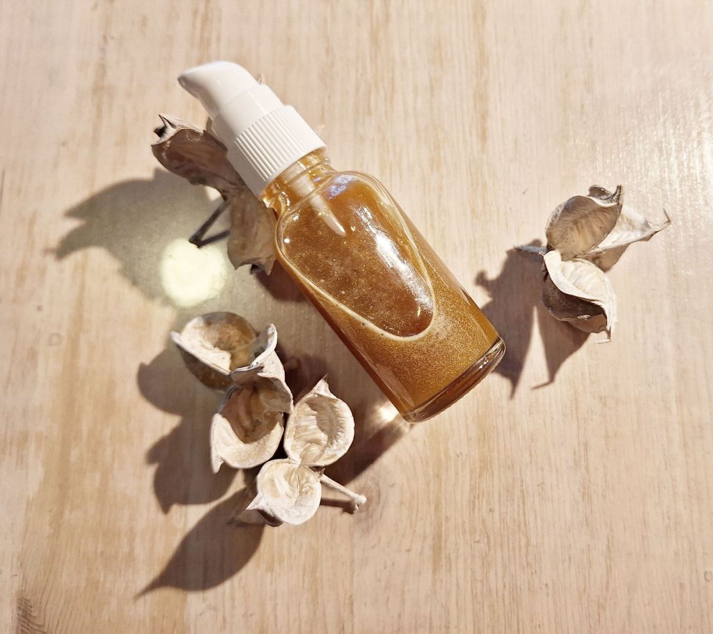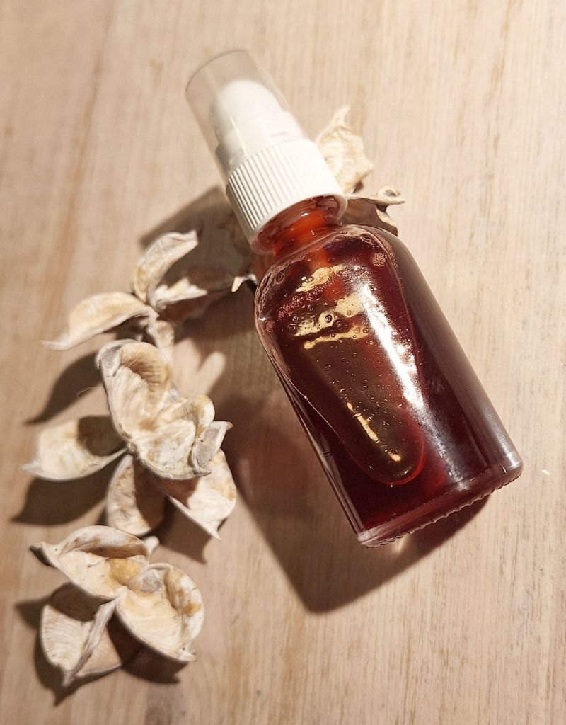 This facial serum recipe is particularly suitable for sensitive skin affected by pigmentation spots because it evens out skin tone and moisturises the skin, as glycerine is a great moisturiser. Geranium also has interesting regenerative properties.