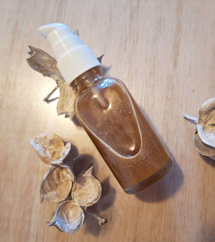 Now extract about 10 ml of this macerated mixture and mix it with about 20 ml of high-quality cold-pressed oil. If you are going to add the astaxanthin capsule, now is the time to do so, stirring continuously so that all the ingredients are thoroughly mixed. Once the ingredients are well mixed, pour the mixture into a small glass dispenser bottle for easy application.