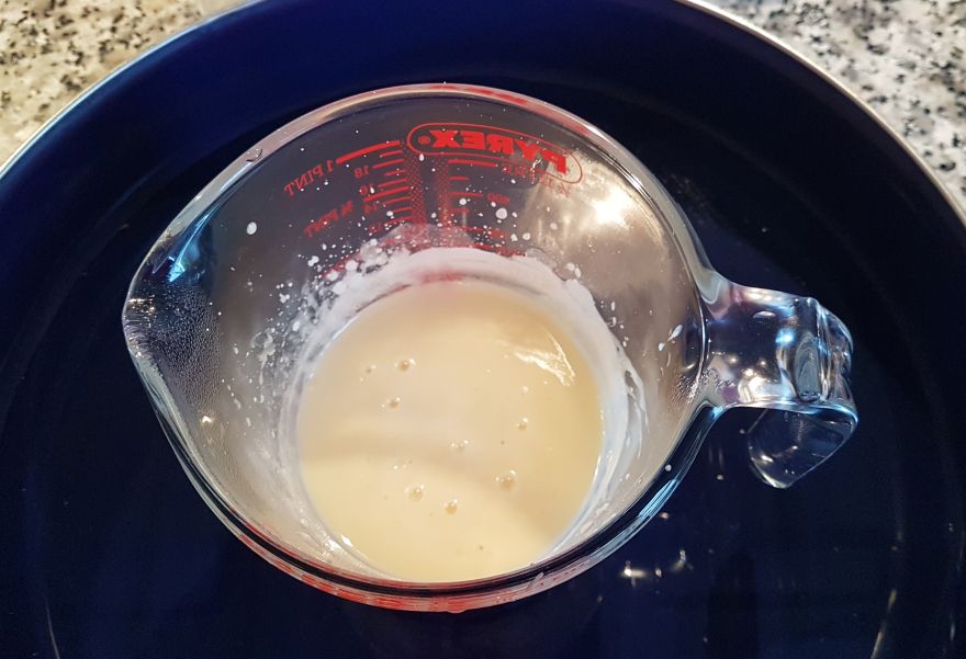 Remove from the heat and add the lime water, stirring constantly with an electric whisk. Leave to cool and then we can use our homemade liniment.