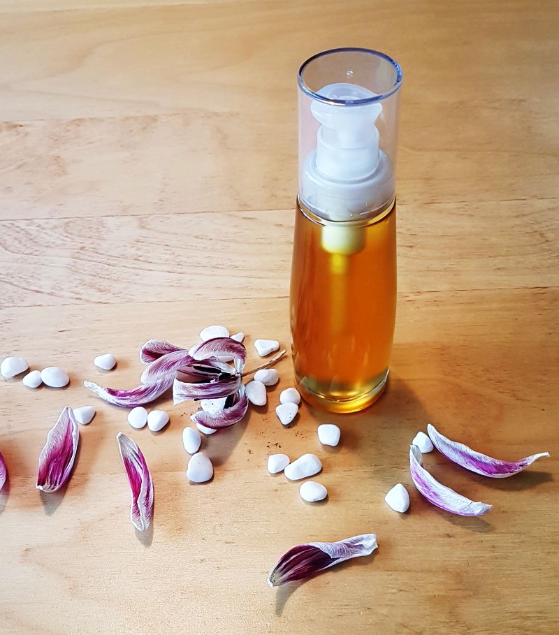 About 150 ml of a mixture of oils of your choice. Example: 100 ml almond oil, 50 ml macadamia oil…